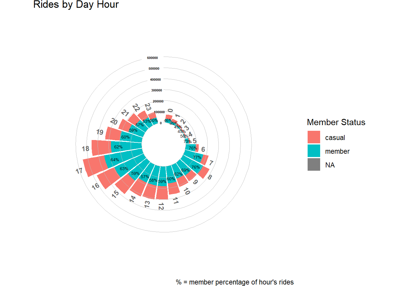 - Members comprise a greater proportion of rides during the morning and late afternoon/evening times