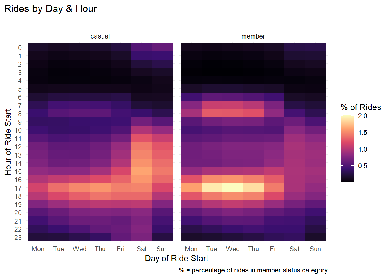 - For casual rides, a greater proportion take place during weekends and late afternoon/evening hours