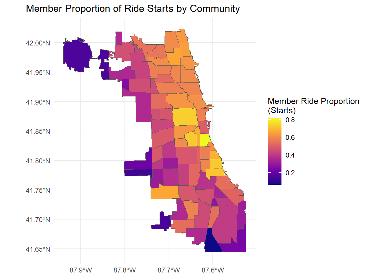 - Communities with a greater share of casual rides are generally farther from the lake and Eastern edge of the city