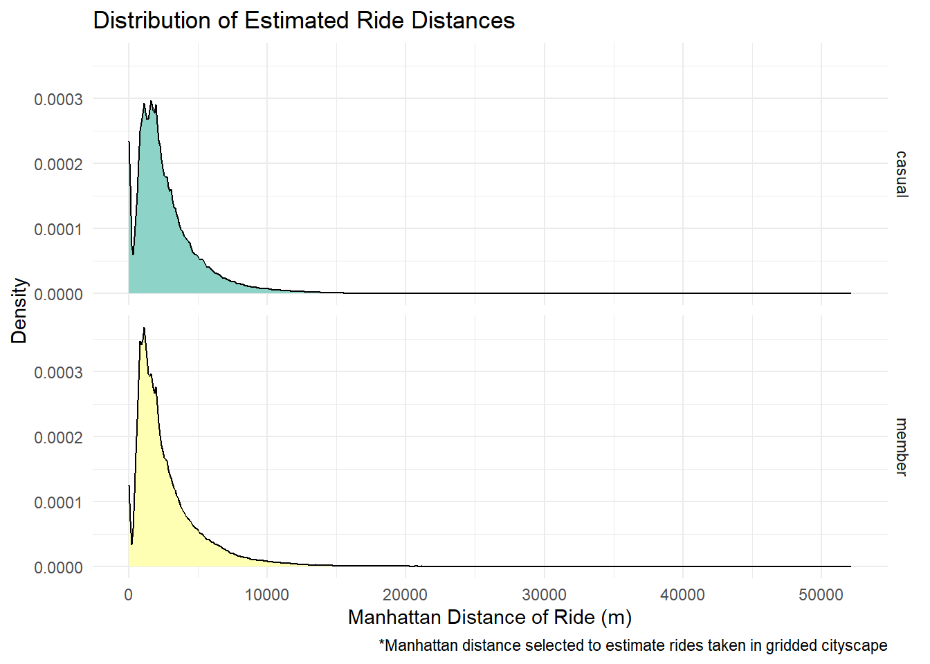 - Estimated ride distances ranged more widely for casual rides, with more trips ending at the same station but also more trips of longer distances