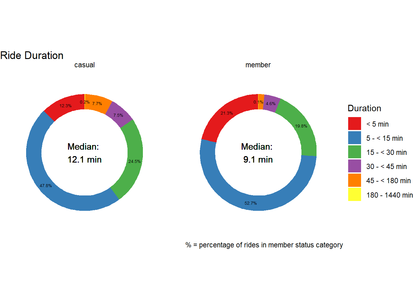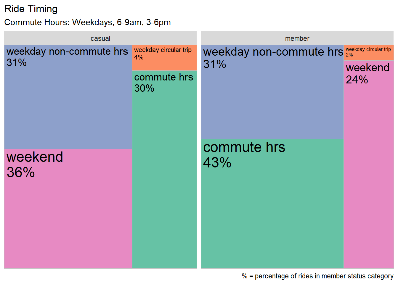 - For member rides, a greater proportion take place during traditional weekday commute hours
