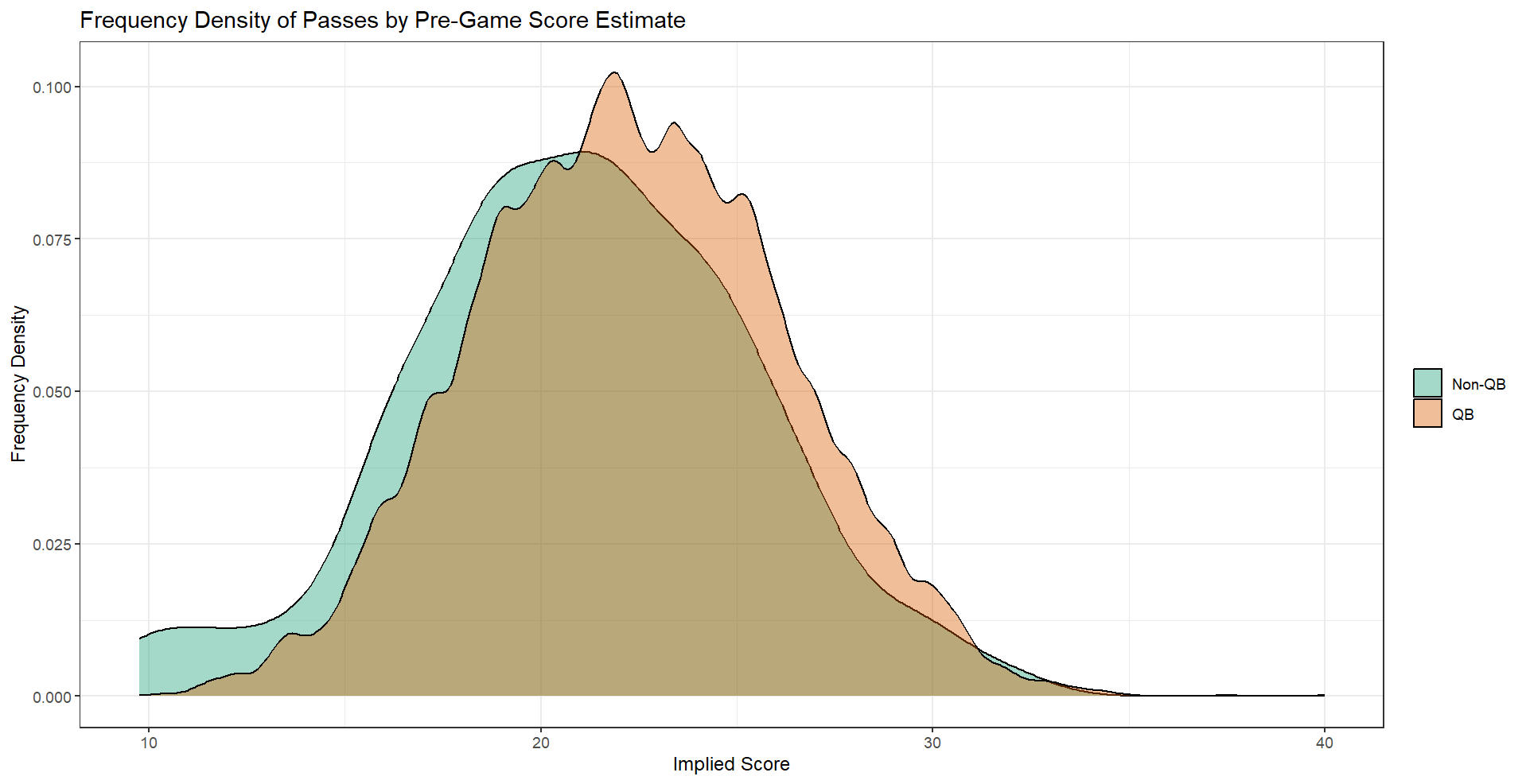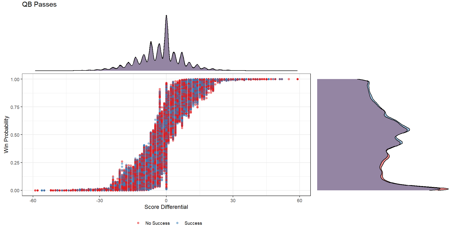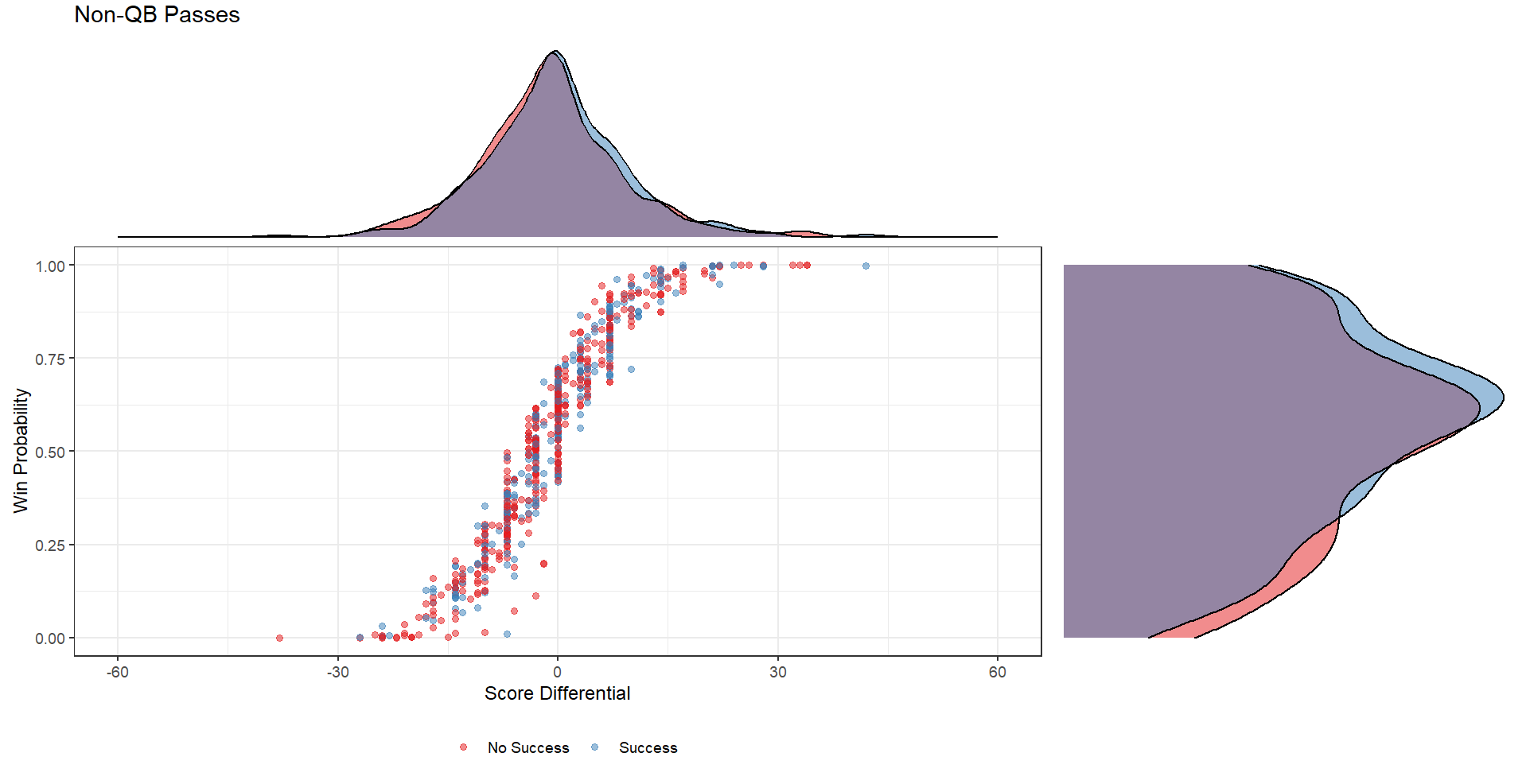 Win probability distributions (right marginal density plots) also differed for the two types of passes, with typical passing peaking towards 0% chance of winning, while non-QB pass frequency peaked around 64% win predicted. Interestingly, no obvious differences in distribution were seen for score differential.