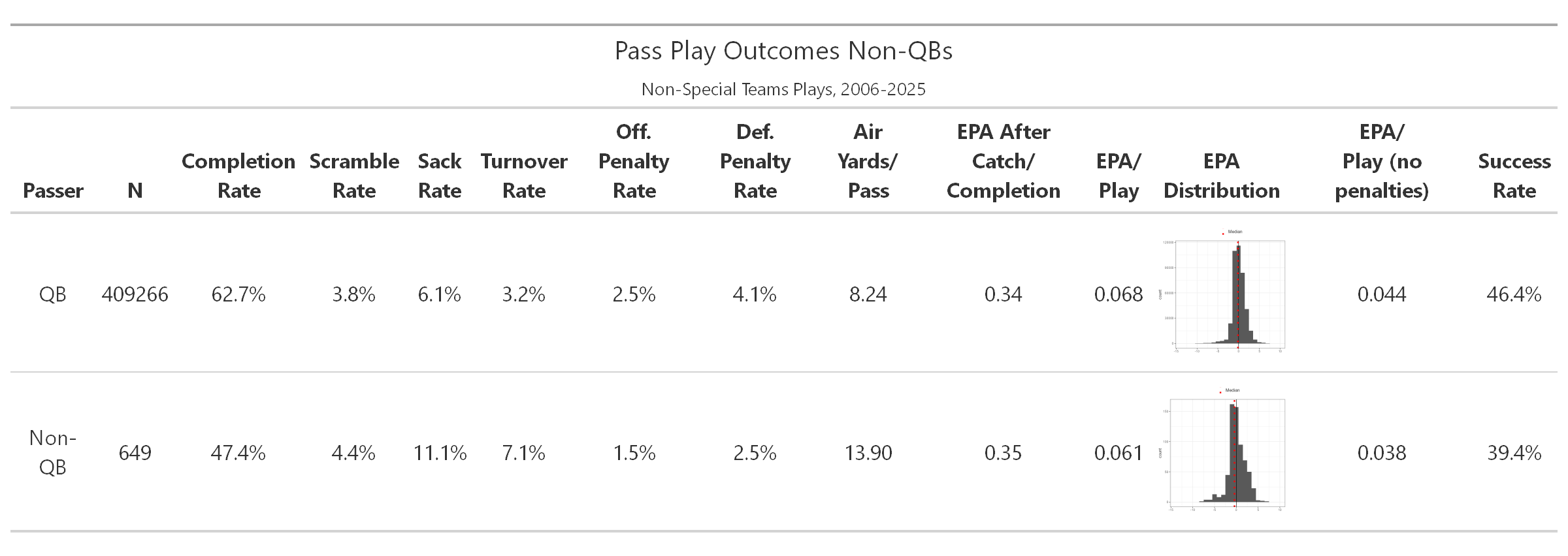 Pass comparisons between QBs and non-QBs were unkind to the non-QB plays. EPA was lower on average, whether including or excluding penalties, but virtually indistinguishable statistically (p=.92 and p=.94, respectively). However, their overall success rate was also 7 percentage points lower, a large difference (p<.001). Penalty-excluded success was similar. This seems to be the result of multiple factors, as they were completed at a lower rate, and yield markedly higher rates of sacks and turnovers. Penalties were also lower for non-QB passes for the offense, but also slightly more so for the defense, so that was a net negative as well.