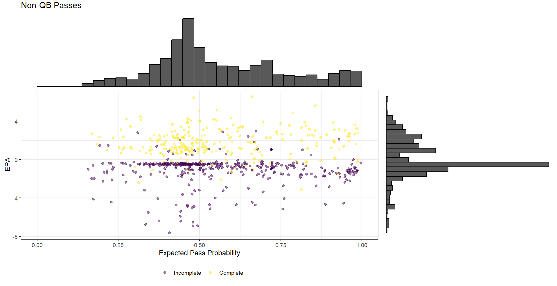 A shortcoming of this work is that it is reliant on the play coder being able to detect whether a pass has been called for a non-QB which may be difficult if they don’t pull back their arm to actually throw, so some planned non-QB passes might just be coded as runs, either for a gain or loss. Some of these plays are likely designed to have an option to run or pass, so binning them into two separate classes would be misleading. This is also arises when false starts are called–there’s no evidence that a trick play was called, but the call might have caused enough anxiety to make one much more likely. A team with actual playcall information could classify these with confidence, but I would doubt this would be shared across the league in a manner to provide enough instances for analysis. Given all this, I would expect our ability to identify instances of non-QB passes to be more limited, but to also be confident in the ones we have identified.