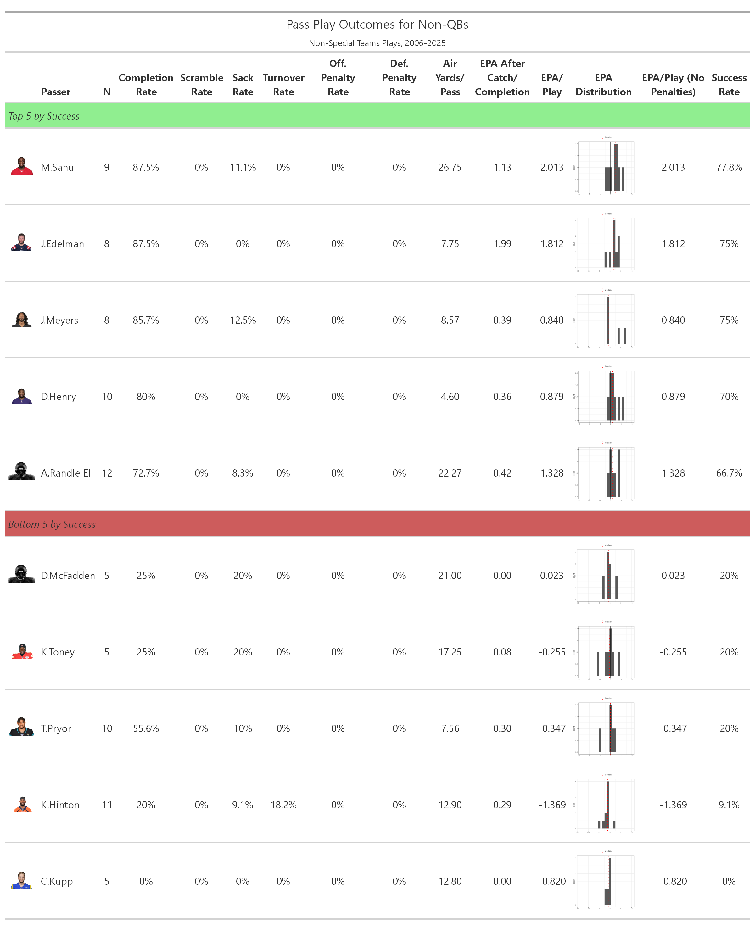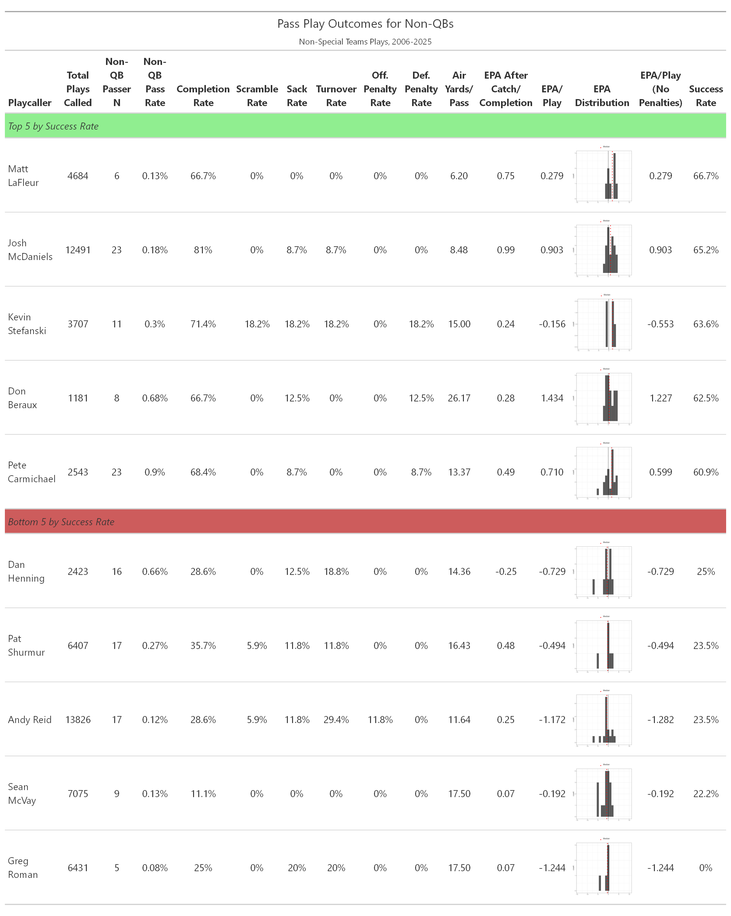 As you’d expect, the limited number of non-QB passes makes it difficult to draw firm conclusions regarding specific playcallers. Josh McDaniels recorded the most during this time period, 23, with 46 having run at least 5 instances. McDaniels was also 2nd highest in success, trailing only Matt LaFleur (66.7%) who only had 6 non-QB passes under his guidance. On the other end of the spectrum, reputationally run-happy Greg Roman has a 0% success rate, but only on 5 attempts. Interesting, highly regarded offensive minds in Sean McVay and Andy Reid are 2nd and 3rd worst.