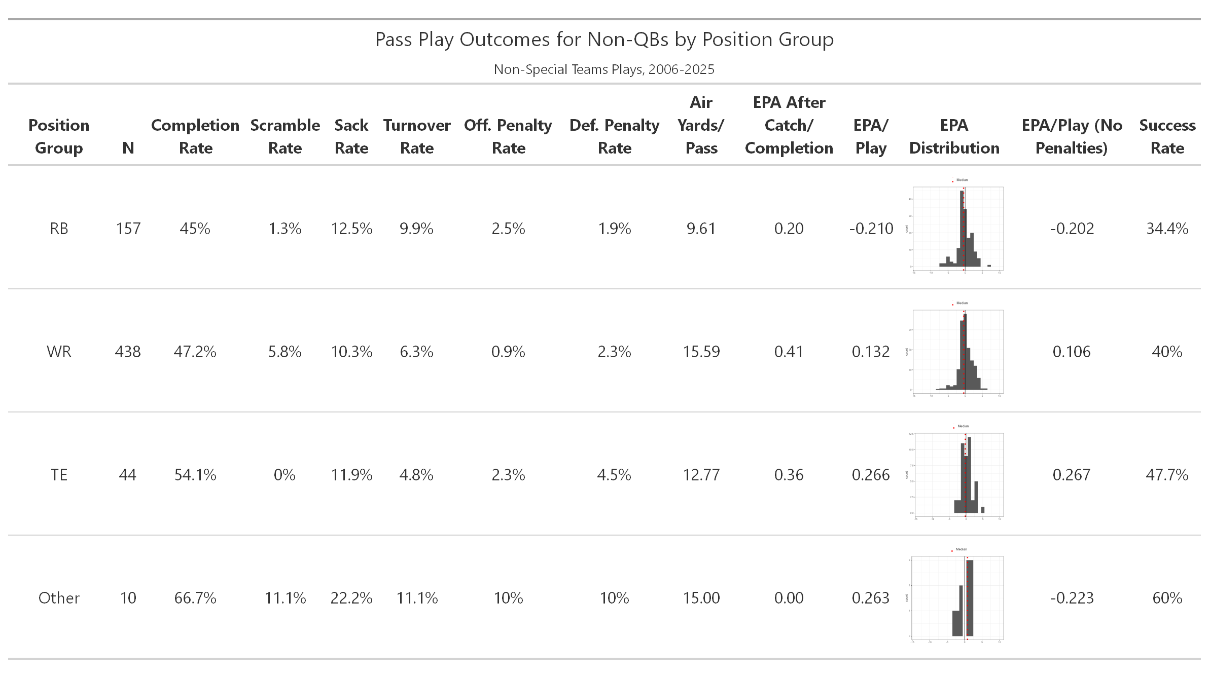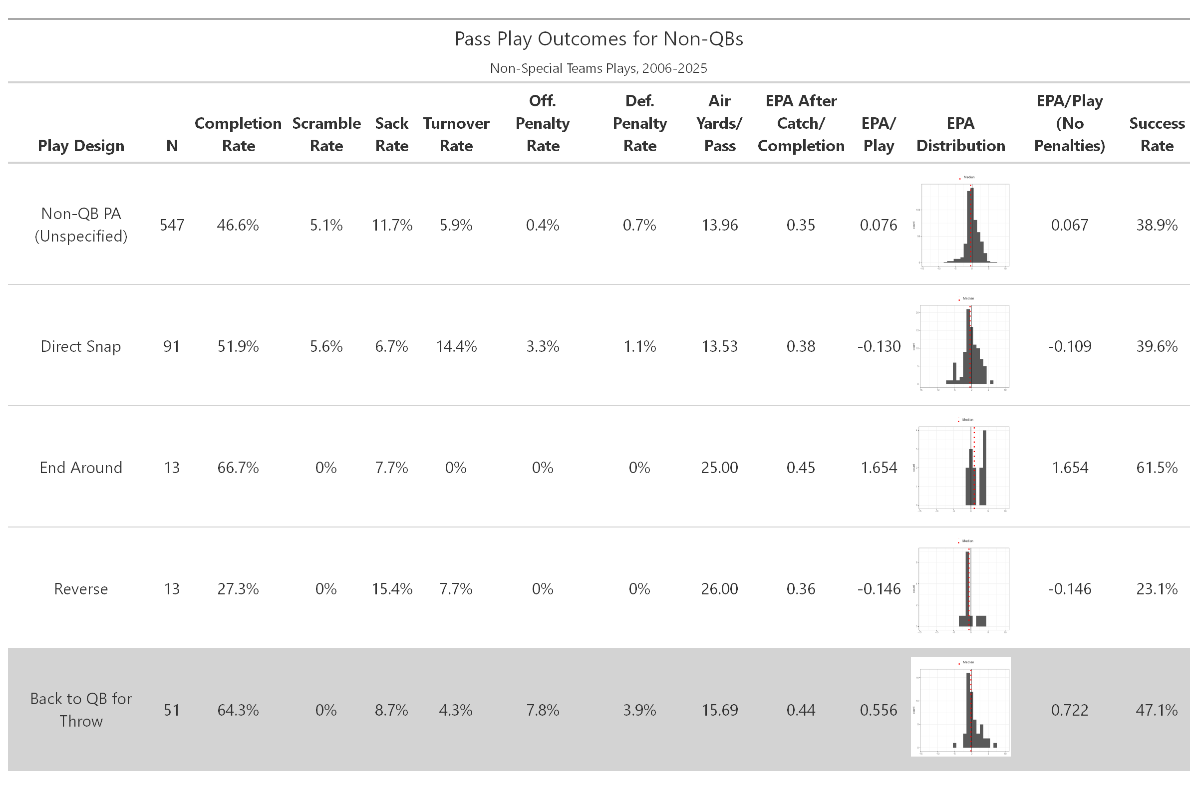 Table. Cumulative Statistics for Non-QB Pass Outcomes by Play Design (Non-QBs)