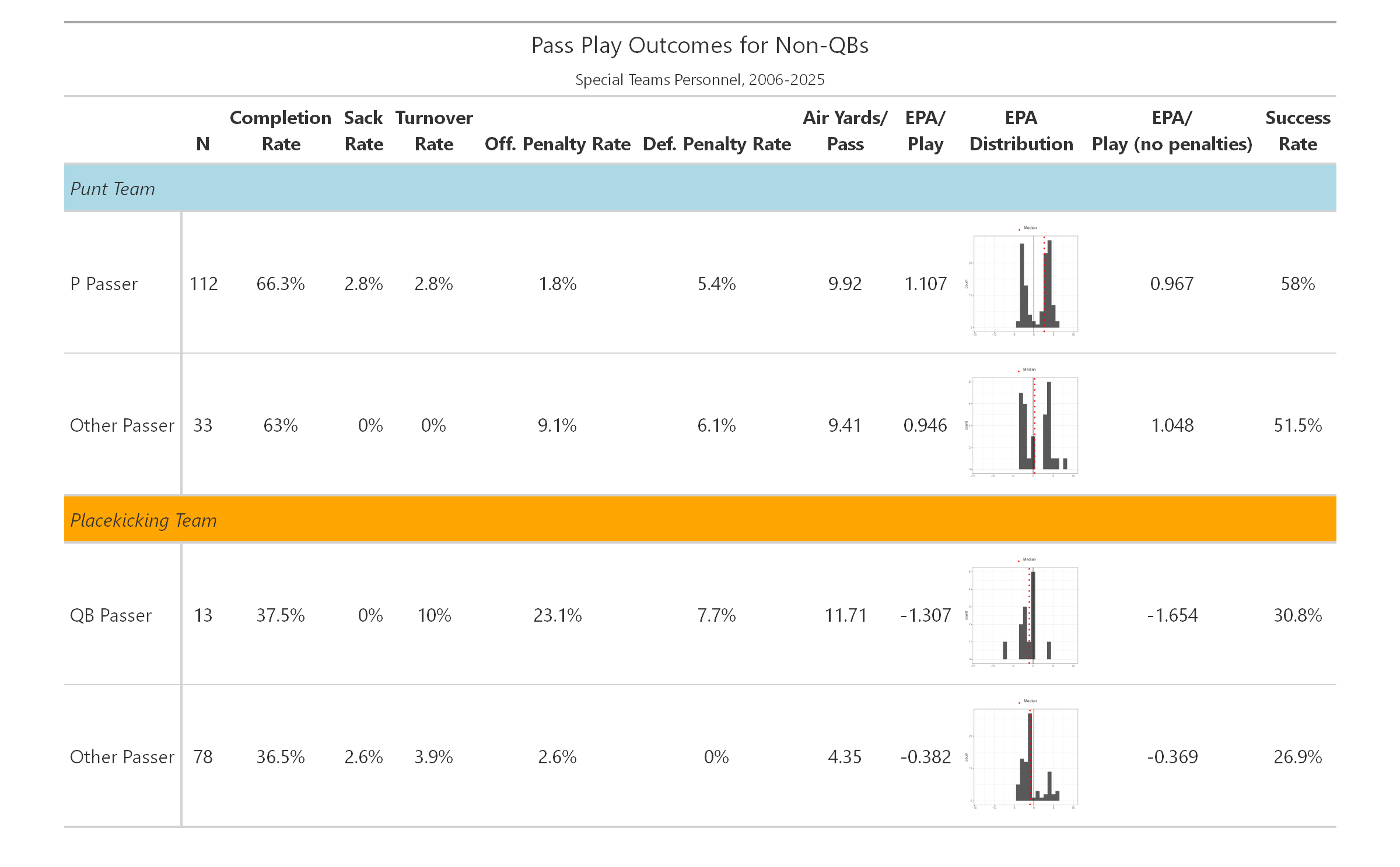 I’ll classify which passes were thrown by QBs and which were thrown by players not identified as QBs in the player database for the 2006-2024 seasons. Also, because they seem like very different scenarios, I’ll separate offensive plays from instances where the team was in punt or field goal formation, since those come from very different formations and circumstances. Lastly, I’ll omit plays identified as “aborted” to eliminate fumbles where the play has likely gone wrong and players might be ad-libbing out of desperation. The final dataset includes not only passes, but sacks and scrambles to get a fuller picture of all the outcomes and their production. I also included penalties, since it’s possible that these kinds of trick plays could result in more penalties on either the offense (e.g. illegal motion) or defense (e.g. pass interference).