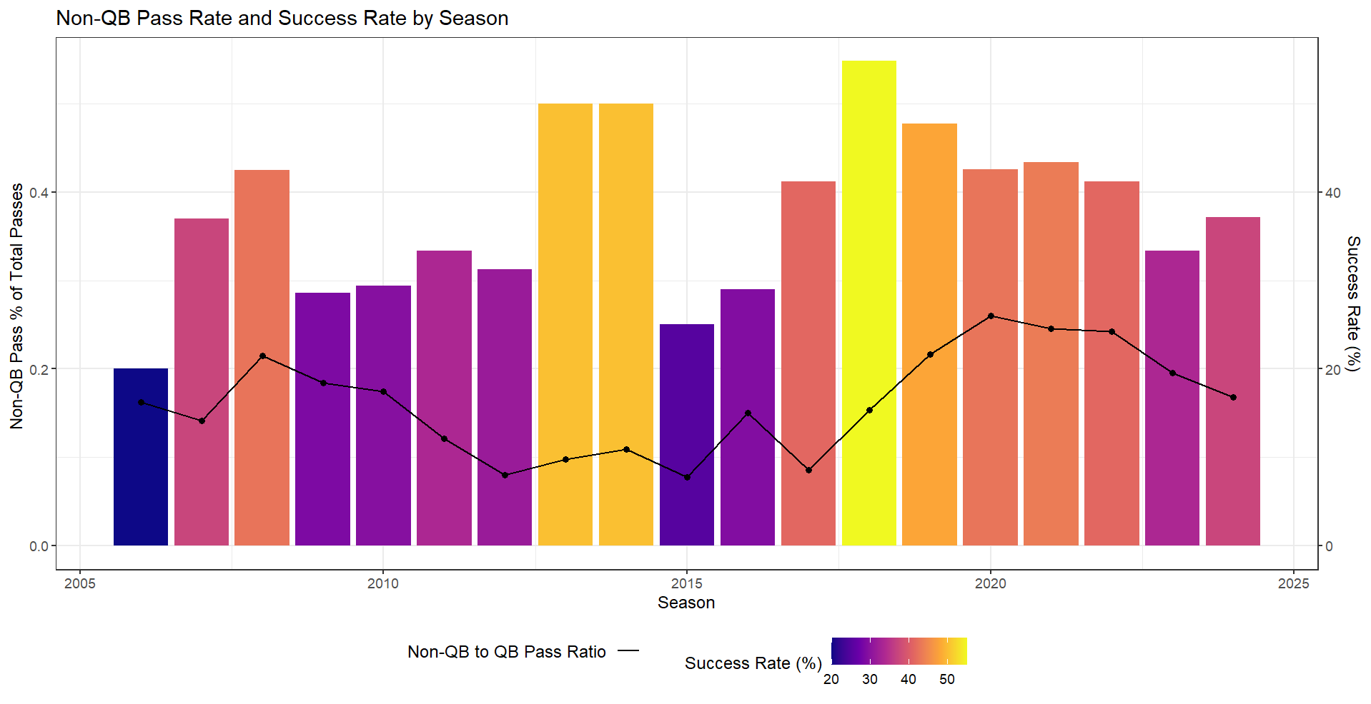 Figure. Non-QB Pass Usage and Success Rate by Season