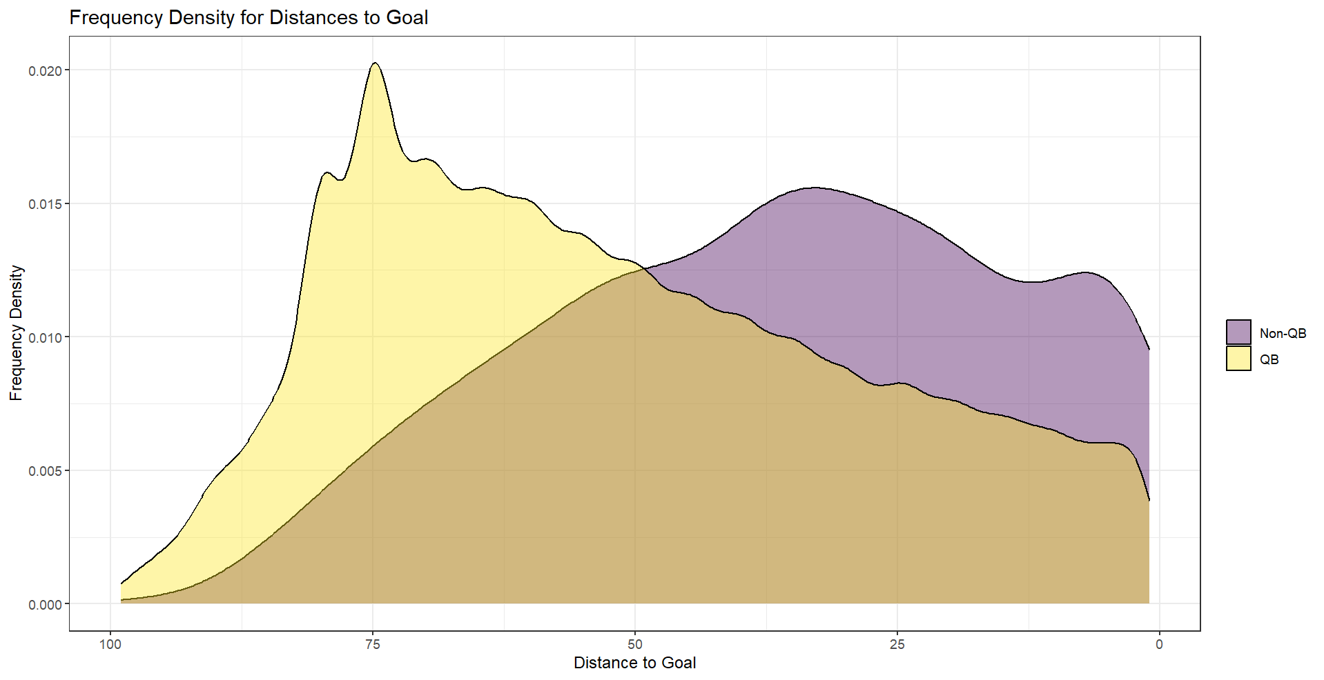 Figure. Frequency Density for Distance to Opposing End Zone at Play Snap