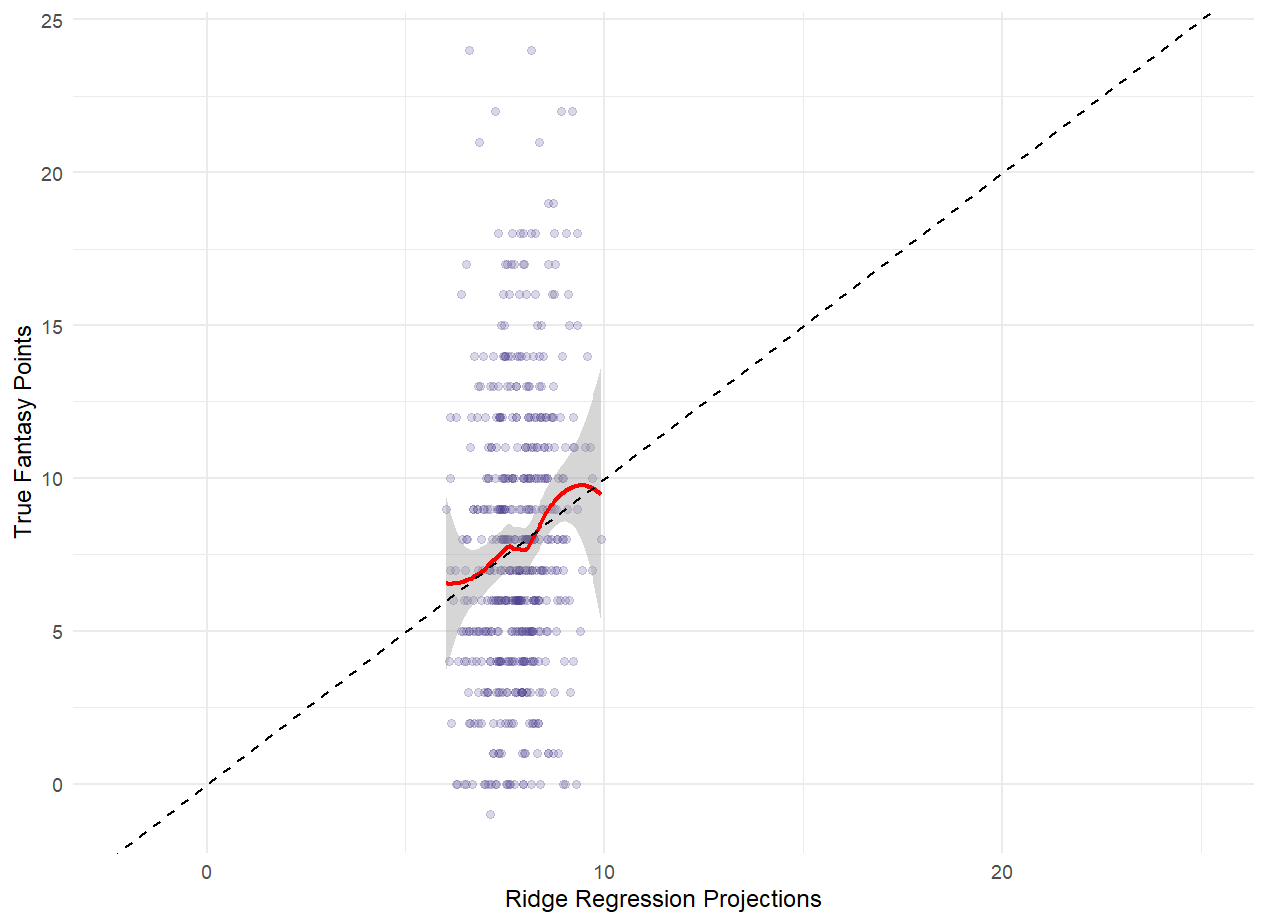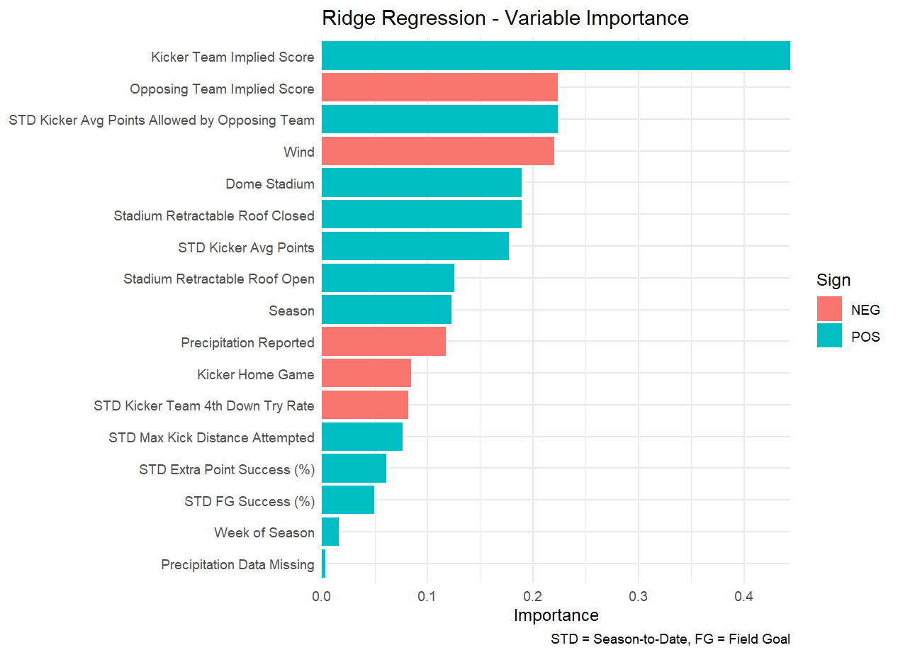 As for the model itself, a look at the variable importance stats puts the expected score of the team’s kicker at the top of this list, with other predictors being markedly less important. I could say I was surprised by the lack of predictive ability from the kicker accuracy metrics, but on the whole, NFL kickers are fairly accurate (kicker season FG percentage mean = 84.6%, SD = 7.8%), so it’s probably difficult to differentiate between those on the higher and lower end earlier in the season, and those that are more inaccurate are more likely to be cut and replaced. As for the direction of the relationships between the predictors, there again weren’t any grand surprises. Wind and precipitation appeared detrimental to kicker totals, while arenas that offered protection from the elements aided them. Higher historical kicker totals and defense-specific kicker point totals correlated with higher totals for that game.
