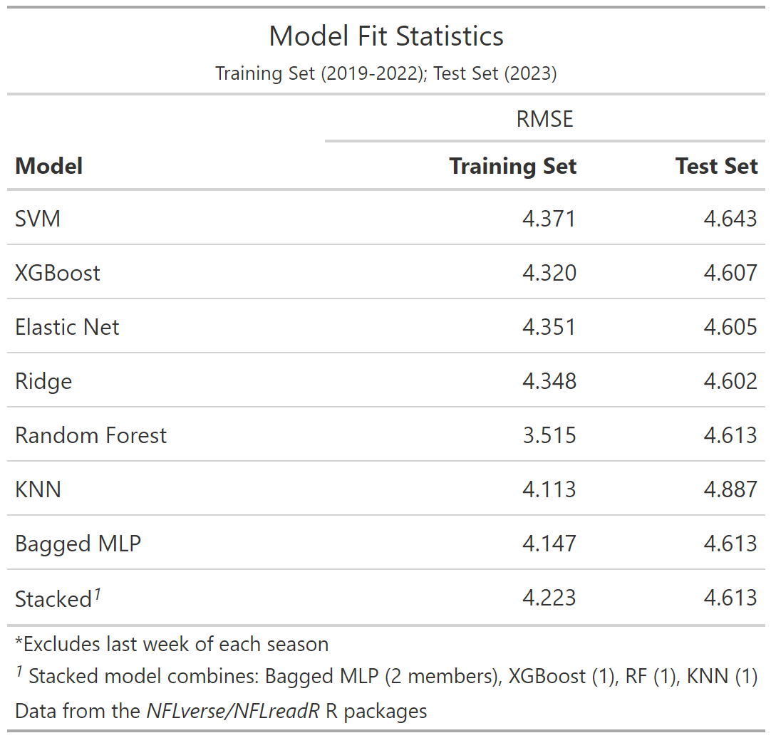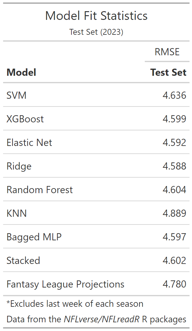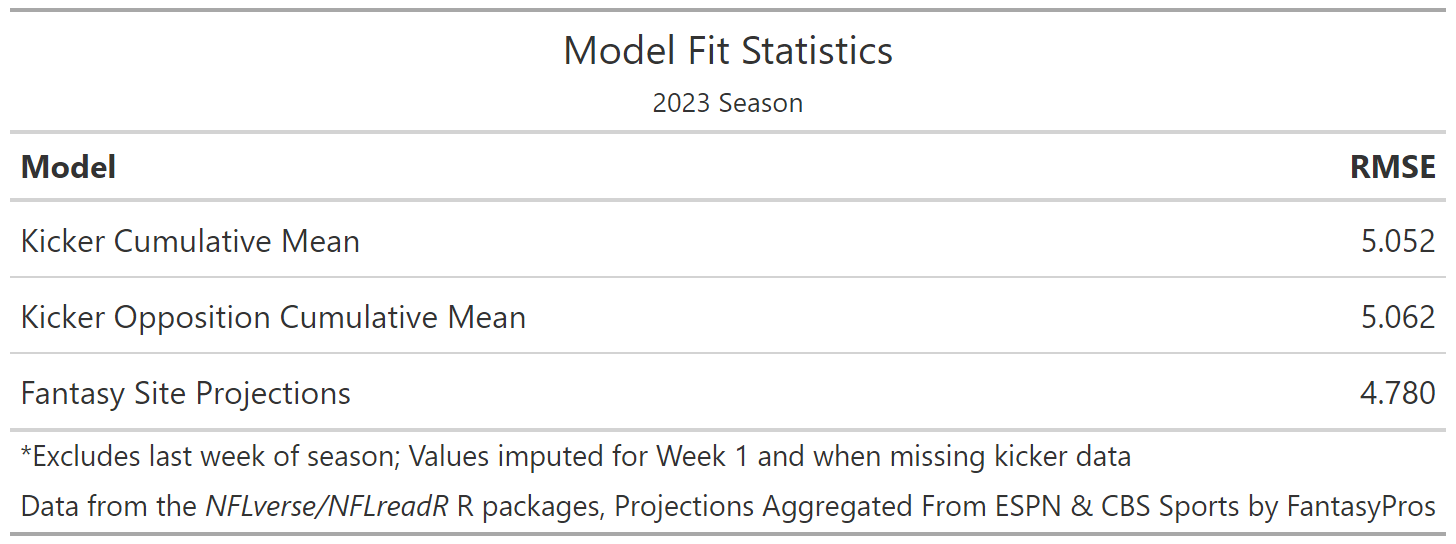 Direct comparisons with the fantasy site projections require a slightly smaller dataset due to projections being absent when the starting kicker is uncertain and our exclusion of games where the kicker was injured in-game. But most of our models still post a modest improvement in prediction during 2023 compared to those provided by league sites using RMSE as our metric. Given their performance with the test data (and the comparatively short running time), I would lean on one of the regression methods for future projections.