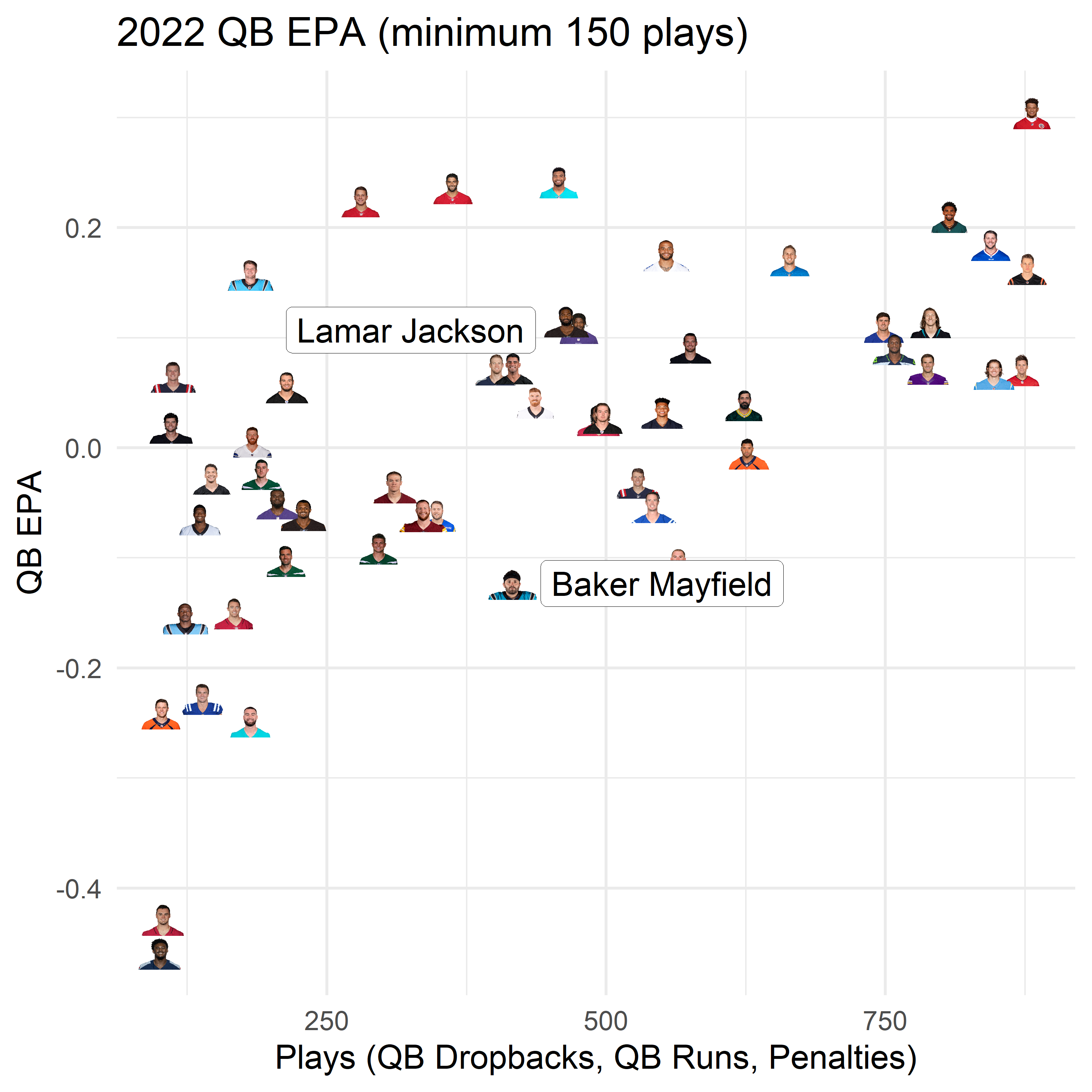 One’s first instinct could be to assemble a predictive model using all these possible influences, including who was playing quarterback. NFLverse data delivers at least some information on each of these play characteristics. Machine learning, fueled with enough data and some computing power behind it, is typically quite skilled at this task. We could then combine all the model predictions for Jackson as QB and Huntley as QB, and compare them to see how much better one would be expected to perform over the other on average.