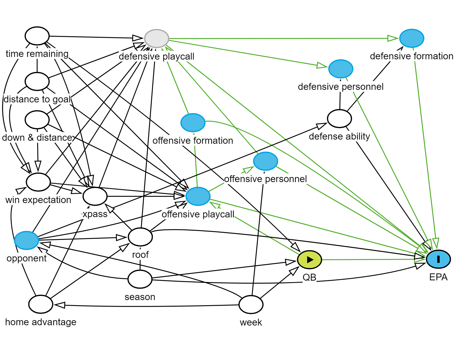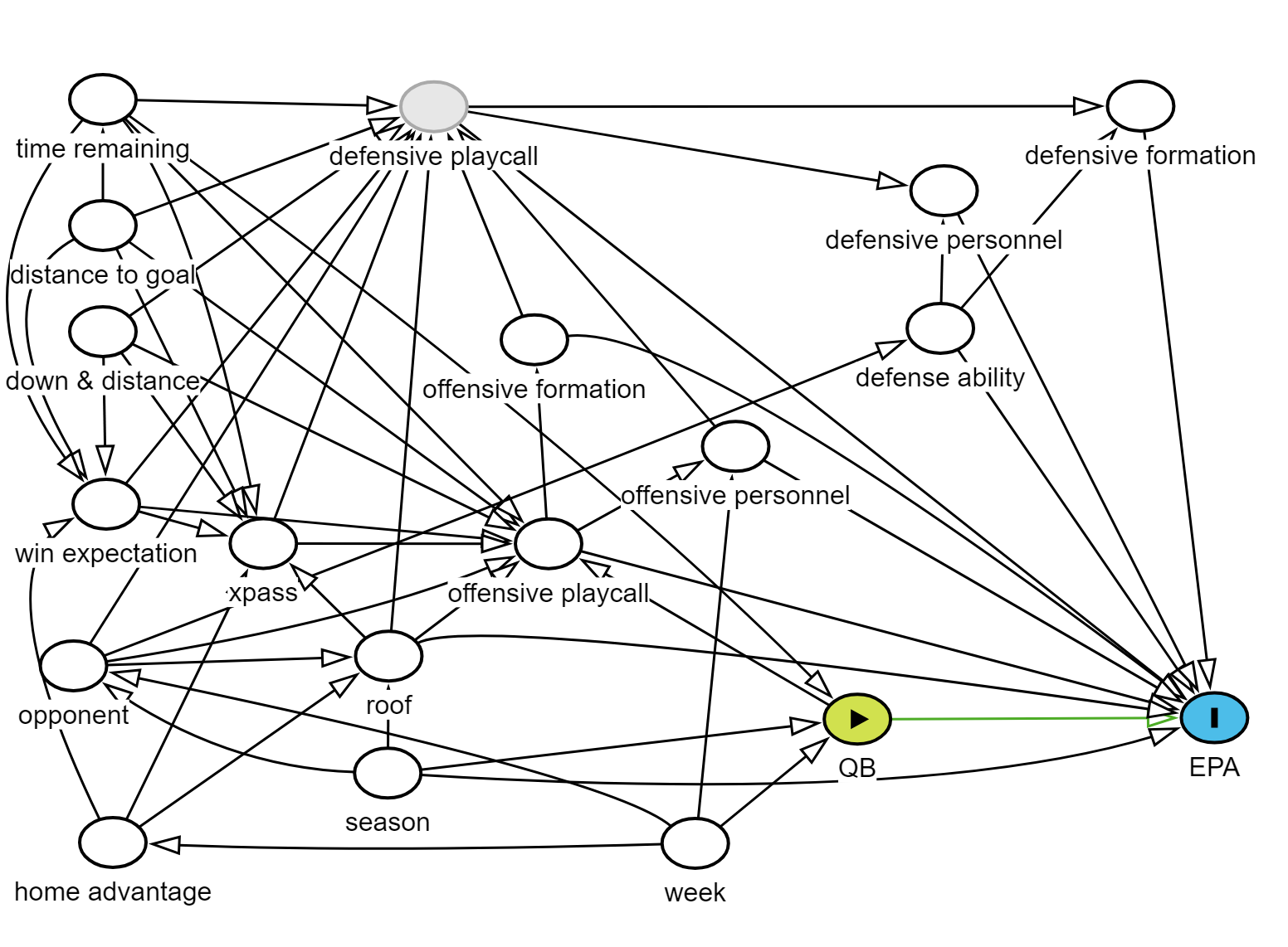 This is where causal inference techniques come in. Randomized trials are typically the gold standard, but an experiment where we randomly swap the two quarterbacks on a play-by-play basis for a season is probably a tough sell to the Ravens organization. Luckily, different fields have developed techniques to try and parse out the magnitude of causal relationships, should they exist, in observational data. What we will need is a conceptualization of how different factors relate sequentially in order to point these models in the right direction. I’ll make an attempt at one here, with some background knowledge and some guidance from whose who have tackled the question previously.