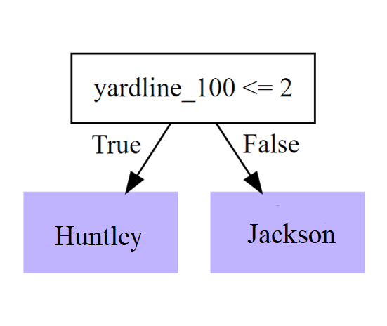 Now, causal forests are built in particular to investigate how different our variable of interest acts on different subsets of the data. Now, in our data, QB choice is dictated by injury, but at the times when both would be available, we could ask if there are circumstances where we would want to use one option versus the other. Are there instances where the model would strongly recommend subbing in Huntley for Jackson? For fun, let’s check with a bit of help from the policytree package.