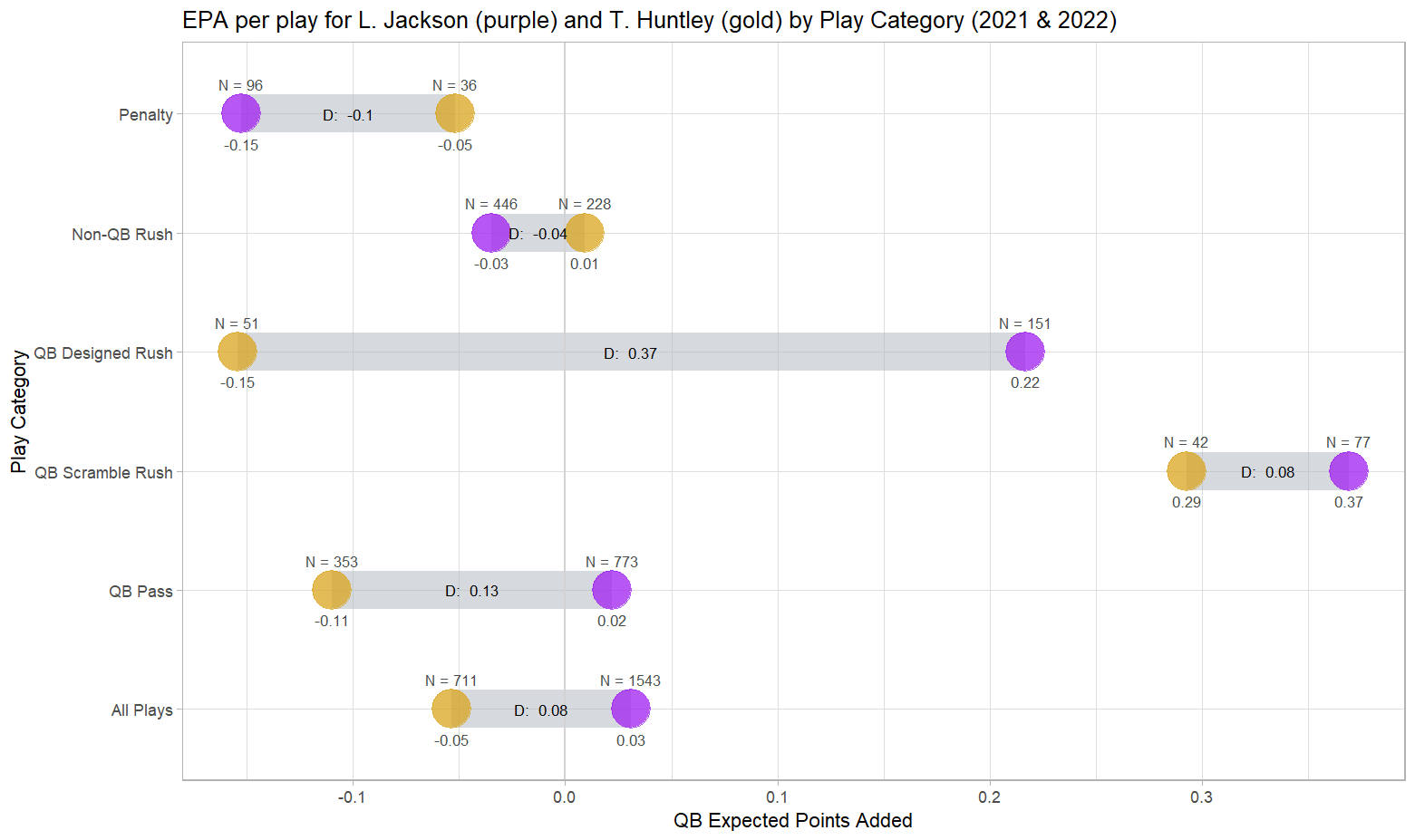 At the bottom, you can see a seeming innocuous overall difference in average EPA (0.08) between Jackson and Huntley across all their plays. But you can also see that for plays involving the QB either dropping back or running intentionally, Jackson outperformed Huntley. The running game seemed to perform slightly better with Huntley as the field general, however. (QB scrambles look particularly good because those ending behind the line of scrimmage are recorded as QB pass)