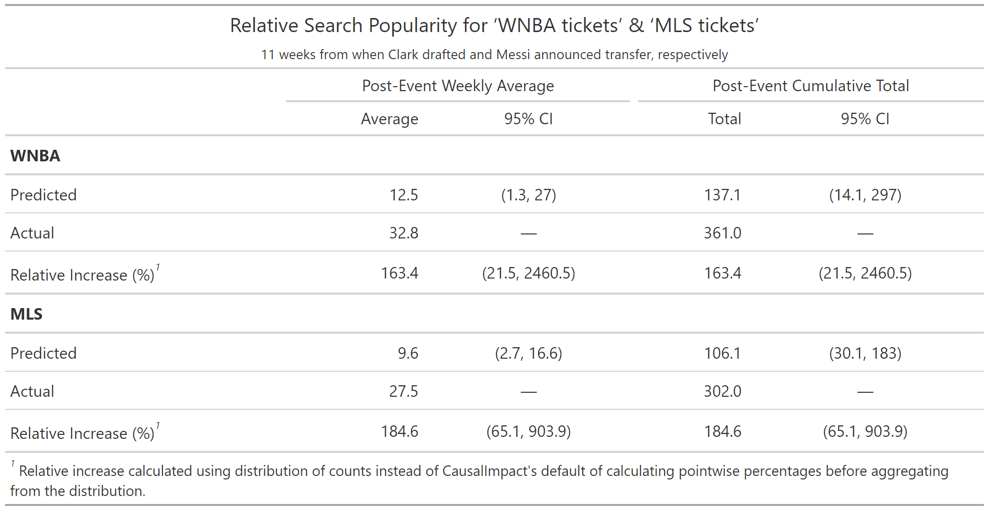 On the other hand, a case could be made that our model is underestimating Clark’s impact to an extent. While Messi’s transfer was less expected considering Barcelona’s efforts to bring him back, Clark moving to the WNBA was little more than a formality after finishing her senior year at Iowa. Thus, interest in her could have generated interest in WNBA tickets even prior to the draft, perhaps evidenced by the higher search popularity in the week before the draft.