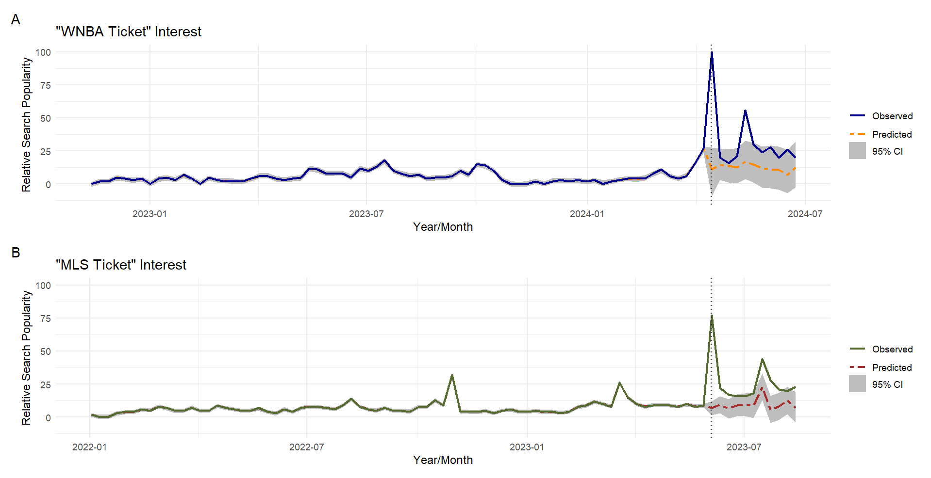 A quick glance at the data from Figure 1 makes finding an impact for both players appear quite promising. Popularity for each peak during week Clark was drafted by the Indiana Fever for the WNBA search, and when Messi announced his transfer to Miami FC for the MLS search.